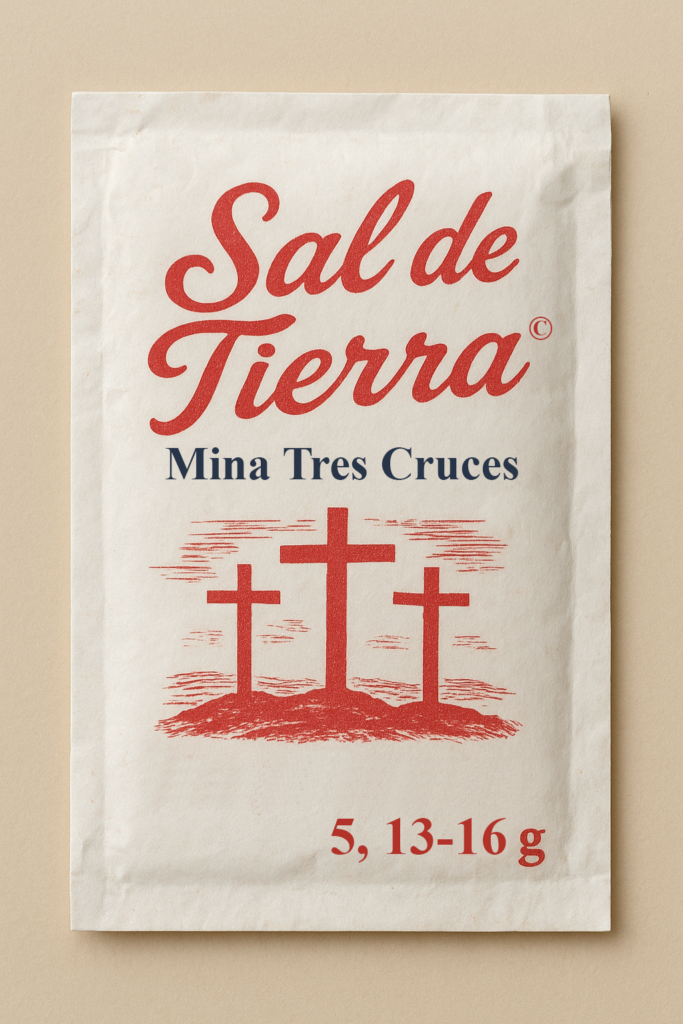 Aclaración sobre el gráfico. Se trata de un sobre de sal de Mina Trescruces. Se ha conjuntado la palabra para que las mayúsculas queden MT (igual que en el evangelio de Mateo), mientras que los gramos 5, 13-16 son los versículos bíblicos. La imagen principal es un linograbado del Calvario.