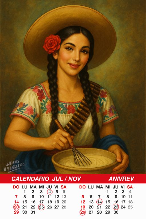 Aclaración sobre el gráfico. La imagen toma el mismo concepto que la del Cartel de Marianne: una Adelita (o soldadora), en estilo de Jesús de la Helguera, revolviendo una masa. Debajo hay un calendario con dos meses: el primero hace trampa con la numeración para señalar los días de la semana en que ocurrieron las revoluciones de Estados Unidos, México y Rusia. El segundo logra que coincidan los días de la semana de las revoluciones de Francia, Rusia —la de febrero, esta vez sí en calendario juliano— y la de Cuba.