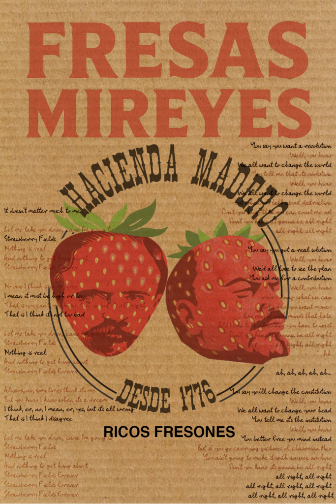 Aclaración sobre el gráfico. La caja usa una serie de palabras para referirse al aristócrata que comienza la Revolución, arruinándoles la fiesta a todos: “mirrey” —fresas mirreyes—, “ricos” y “fresones” son, en el argot mexicano, palabras empleadas para referirse a una persona adinerada por el trabajo de sus padres y que vive en una burbuja de la comodidad. Dos de las fresas tienen los rostros de Madero y Lenin. Les acompaña la fecha de la Declaración de Independencia de Estados Unidos. A los lados, como si se hubiera tallado en el cartón, las letras de Strawberry Fields Forever y Revolution, de The Beatles, explican, con secciones remarcadas en negro, un poco el idealismo del aristócrata frente a la cruda realidad de una Revolución.