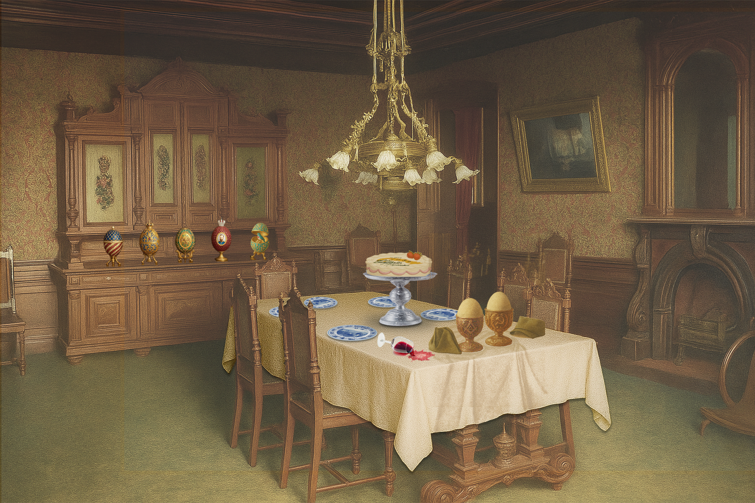 3. Respecto a las imágenes segunda y la cuarta (de la cocina y el comedor, respectivamente), notará usted que hay varios elementos sobre los que, al pasar su cursor, se habilita un hipervínculo (por ejemplo: la harina, la leche, el calendario, las fresas, los huevos Fabergé, etcétera). La dinámica es la misma: cada vínculo lleva hacia una entrada secundaria.