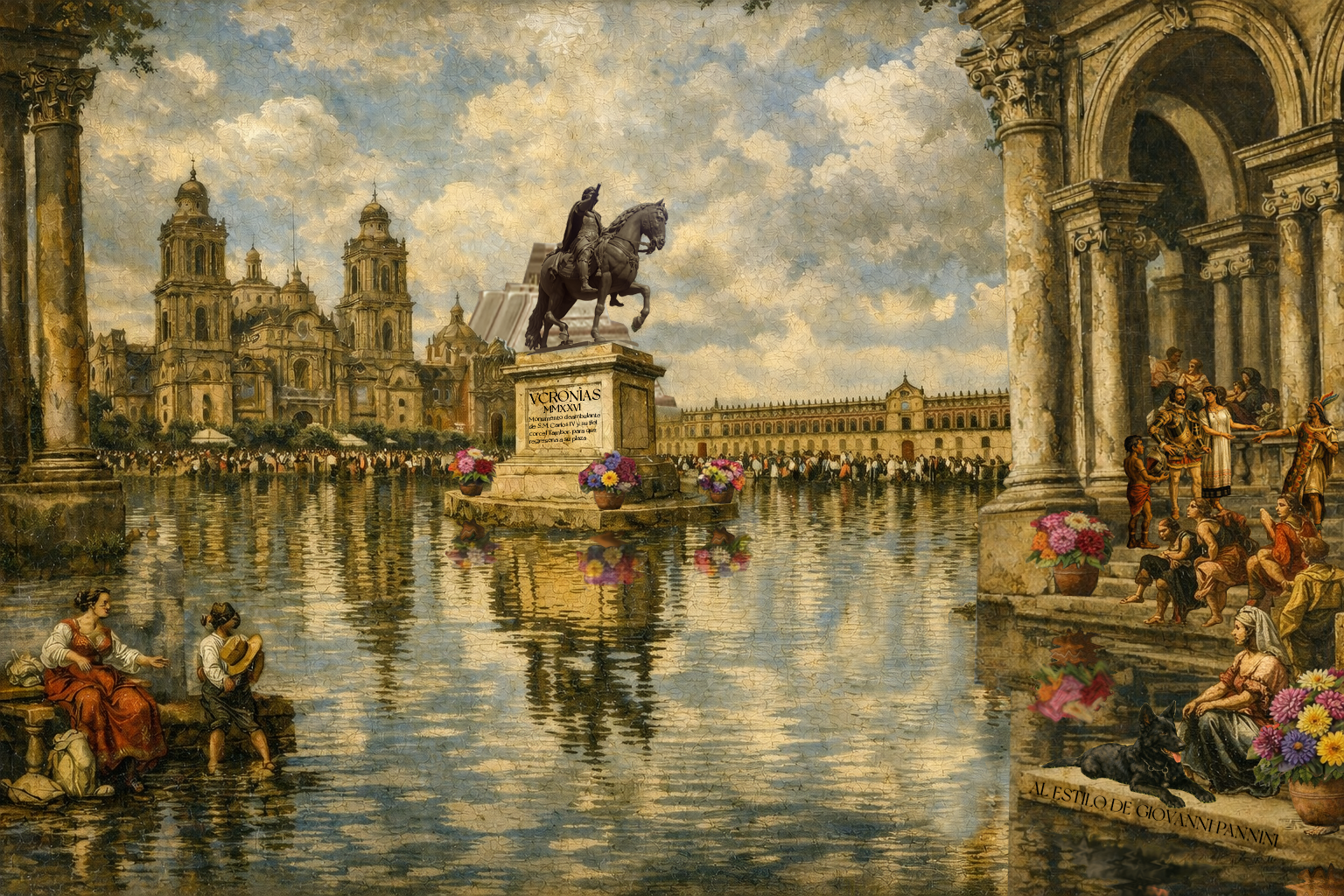 El Palacio que no se olvidó de ser monumento y plaza pública en plena estación de Flor Marchita, que tiene el más vivo de los rojos que ni el mismo estilo de grabado monocromático de Giovanni Battista Piranesi puede apagar. Al frente uno de los monumentos deambulantes.
