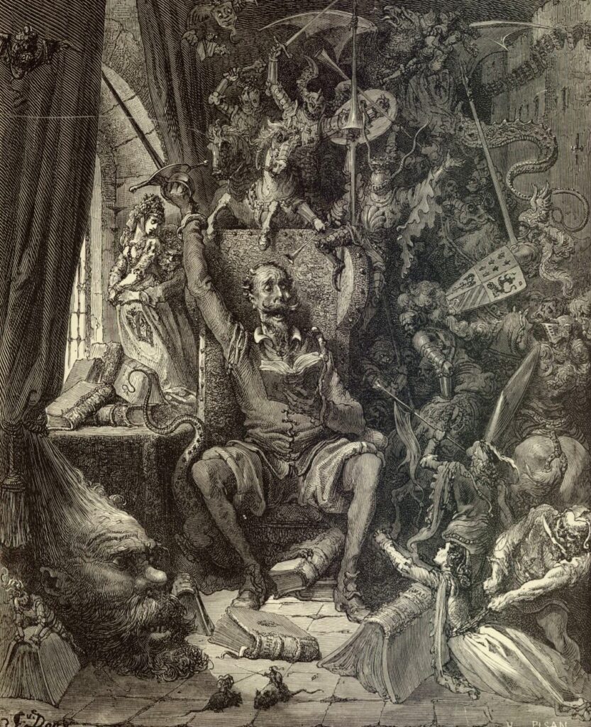 Esta transición de la realidad sacramental a la ontología del espectáculo acompaña las dos formas extremas de experiencia subjetiva que expone Cervantes. En el comienzo de la novela, el mundo ideal de los gigantes, los ejércitos de infieles y los raptores de doncellas prevalece sobre la objetividad de los molinos de viento o las manadas de carneros. Sólo los golpes y las pedradas despiertan esta conciencia idealista del trickster a un sujeto nuevo rigurosamente escéptico, que se da expresión múltiples veces bajo la divisa “los malignos magos que me persiguen…” (II:16). Por el contrario, en la segunda parte, Don Quijote se confronta con un mundo espectacular por derecho propio. Es bajo el poder absoluto de esta segunda realidad de ficciones y fantasmagorías que el mundo imaginario de Don Quijote obscurece y acaba extinguiéndose a lo largo de acciones dramáticas que ya no son esclarecedoras ni tampoco resultan cómicas, al contrario de las aventuras de la primera parte.
